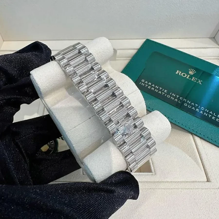 Hoàn thiện bằng bộ vỏ Oyster vàng trắng 18K tạo cảm giác “đầm” tay, đem đến những trải nghiệm sử dụng thật sự đẳng cấp và khác biệt. Sự kết hợp giữa mặt số tròn và dây đeo President 3 khớp nối mảnh, thiết kế bộ khóa gấp chắc chắn giúp ôm gọn vào cổ tay người dùng, tạo nên dấu ấn riêng của thương hiệu lâu đời.