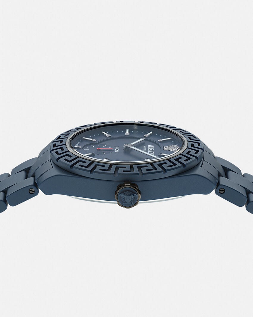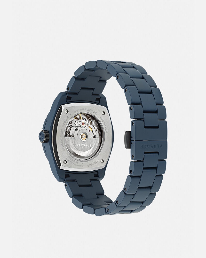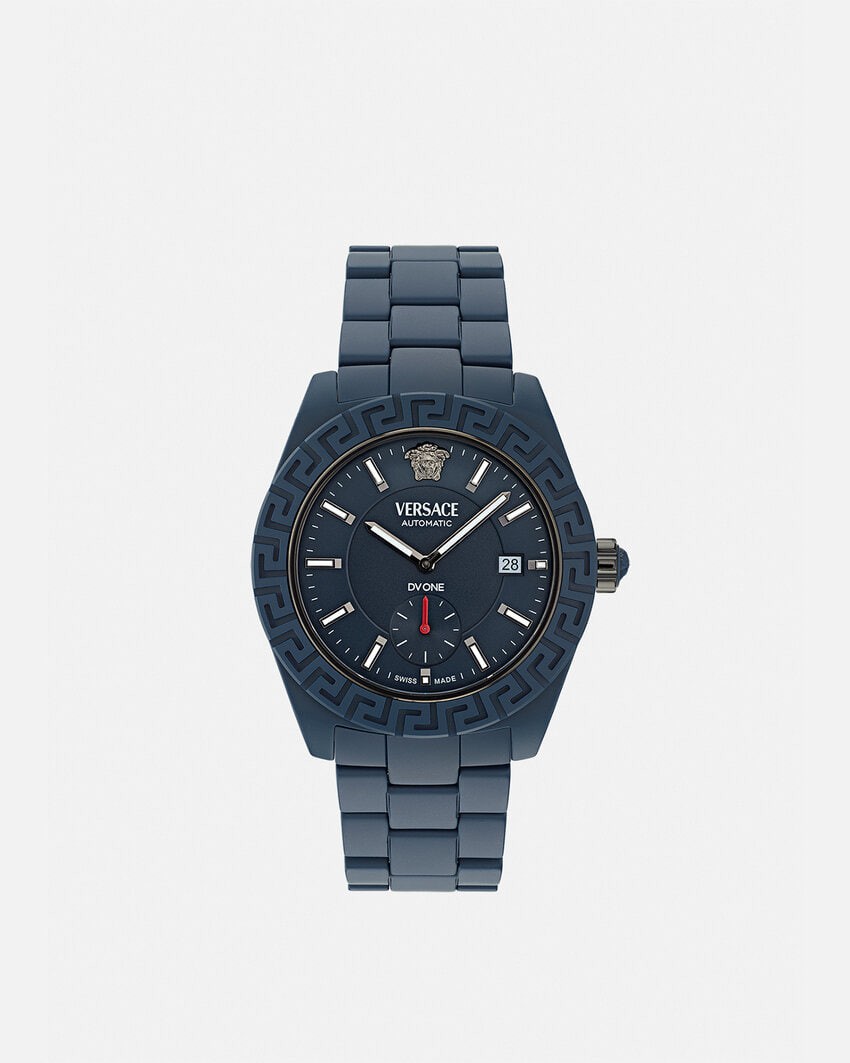 This ceramic automatic watch is rich in details, with Greca on the bezel and Medusa at 12 o'clock. The dial is engraved with "DV One" and comes with a ceramic strap. All Versace watches carry the "Swiss Made" logo.